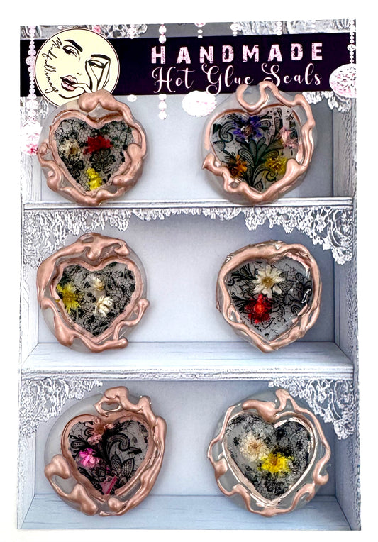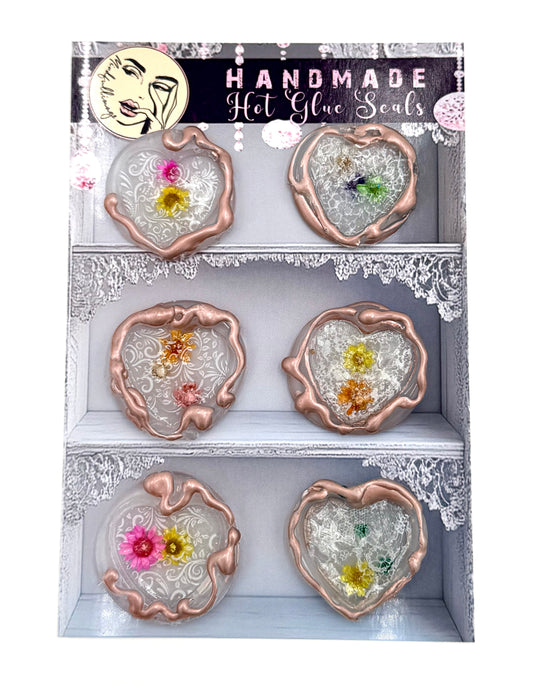 My wax seals are a creative journey in design, blending innovative techniques and unexpected materials. Using hot glue, I craft intricate lace-inspired patterns with shimmering foils, embed real dried flowers, and incorporate a mix of unconventional media to create truly one-of-a-kind seals. Each piece is a delightful fusion of texture, color, and surprise—perfect to add a touch of charm and personality to your special messages.