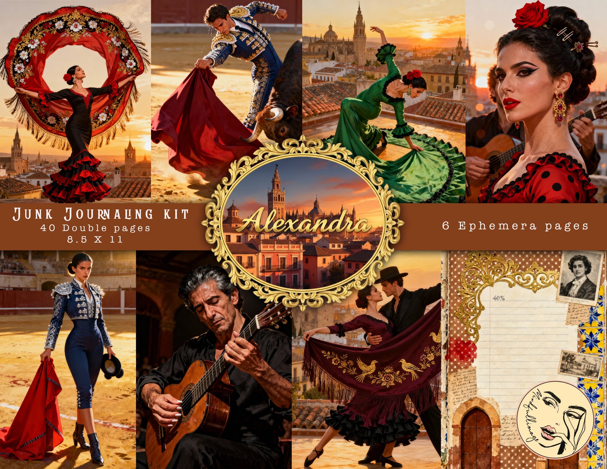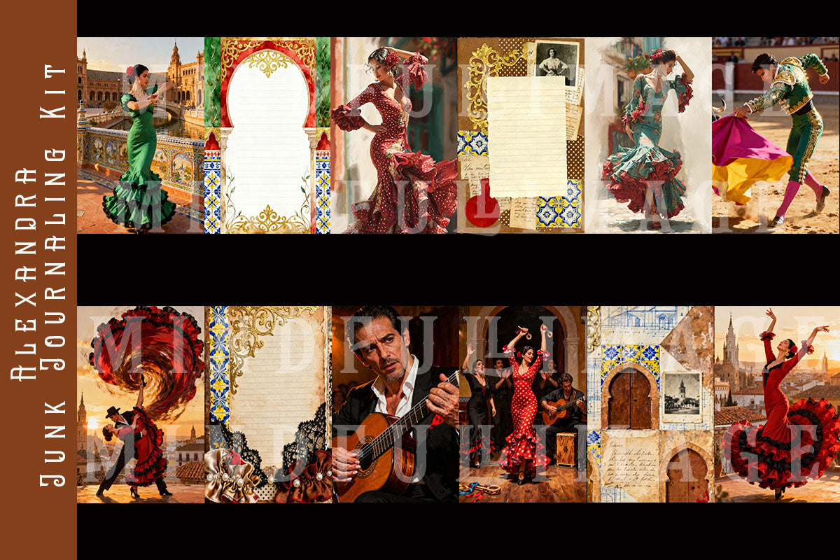 Alexandra is a flamenco‑inspired junk journaling kit that captures the beauty of flamenco dance fashion and the culture of Spain. Kit Includes forty double pages and 6 ephemera pages. Perfect for Junk Journaling or scrapbooking.